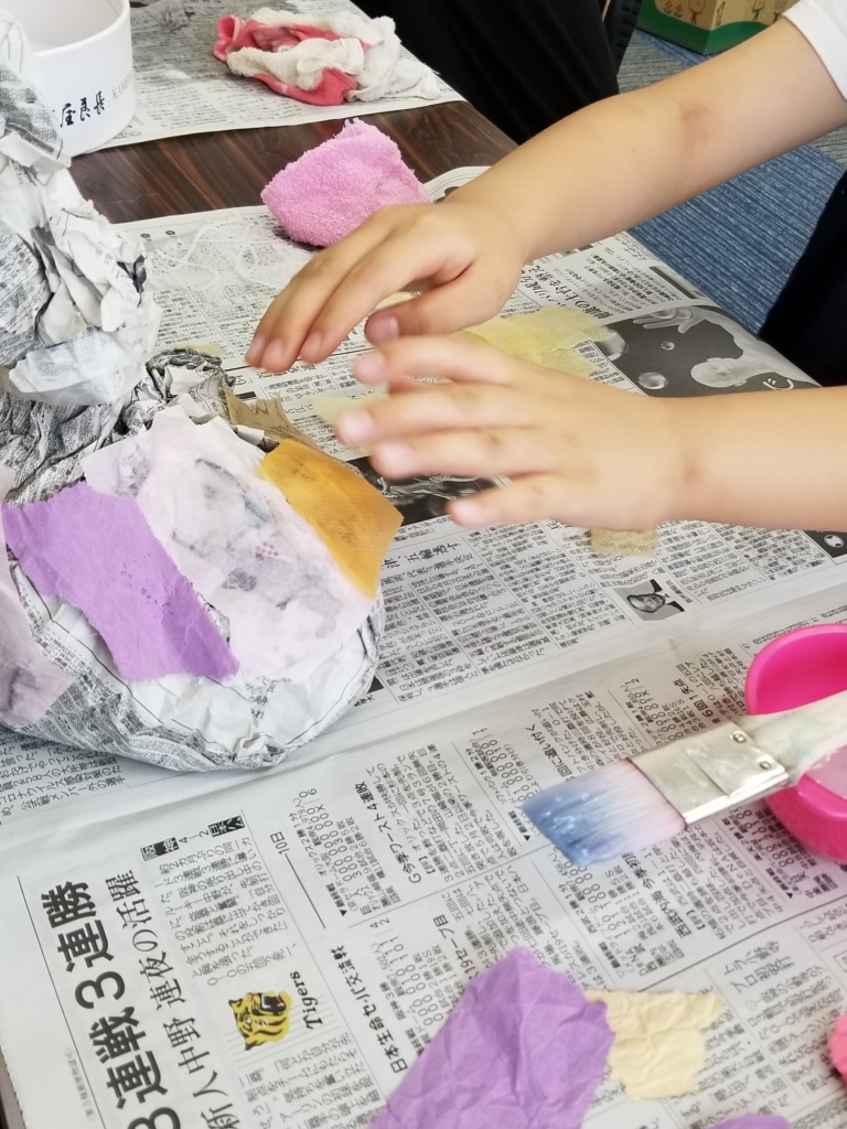 くしゃくしゃにした画用紙・透けてる和紙や不織布を自分の好みで貼り付けていきます。