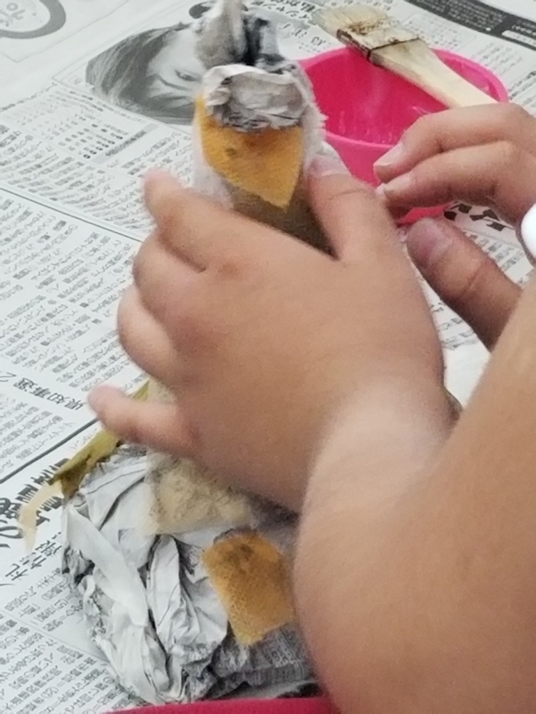 9日に 新聞紙で玉ねぎの形づくりしているので、16日は色付けしました。