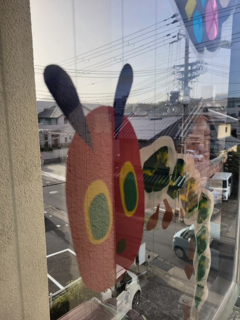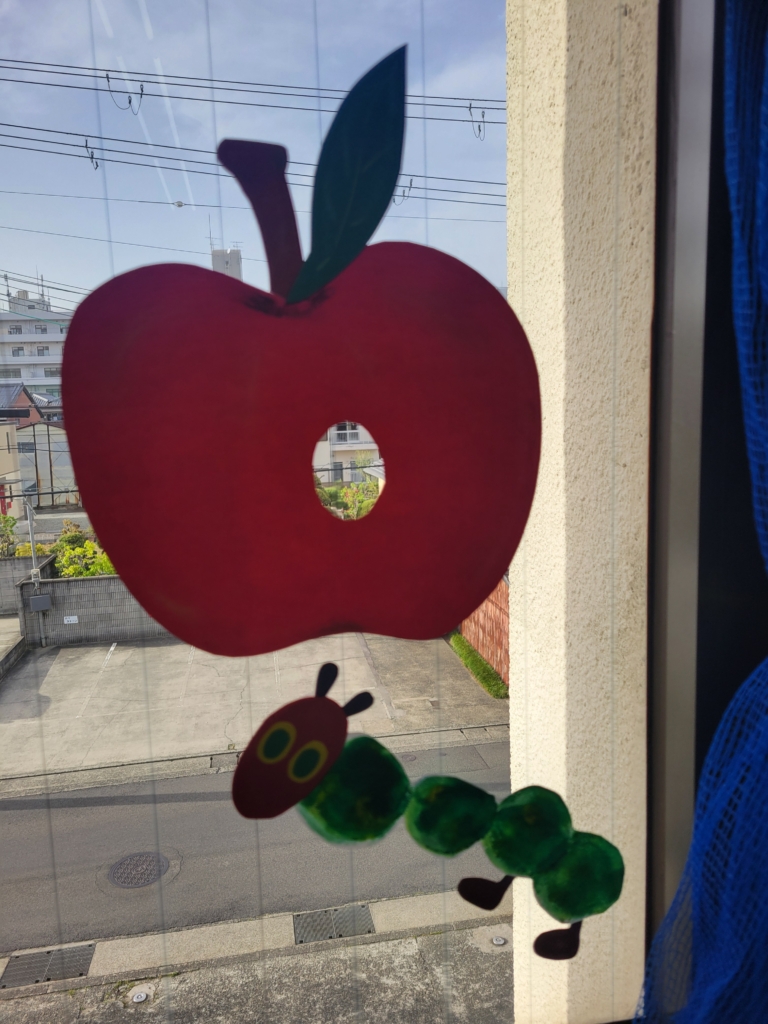 頭の部分は、外側にはあおむしの顔で…室内側には、子どもたちの顔になっています。