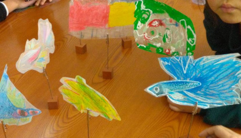 テーブルの上には、子どもたち一人ひとりが心のままに描いた、世界にひとつだけの魚が並びました。
