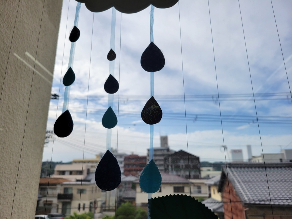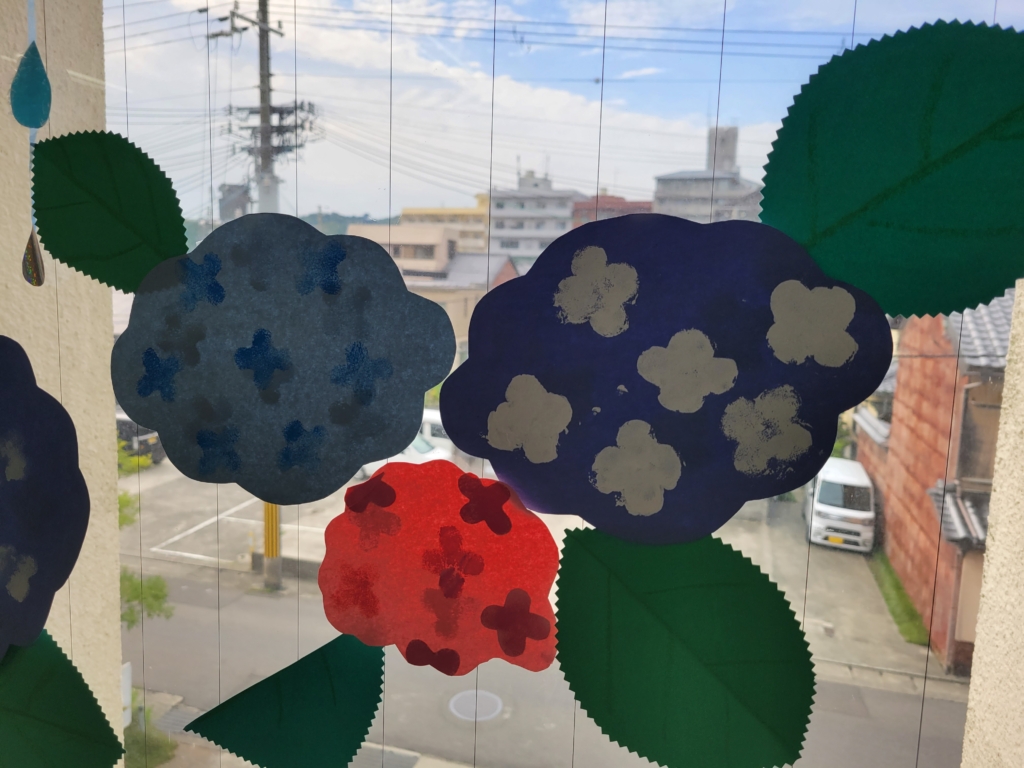 先日、子ども達に作って貰ったアジサイの花スタンプを中心に窓も梅雨模様になっています!