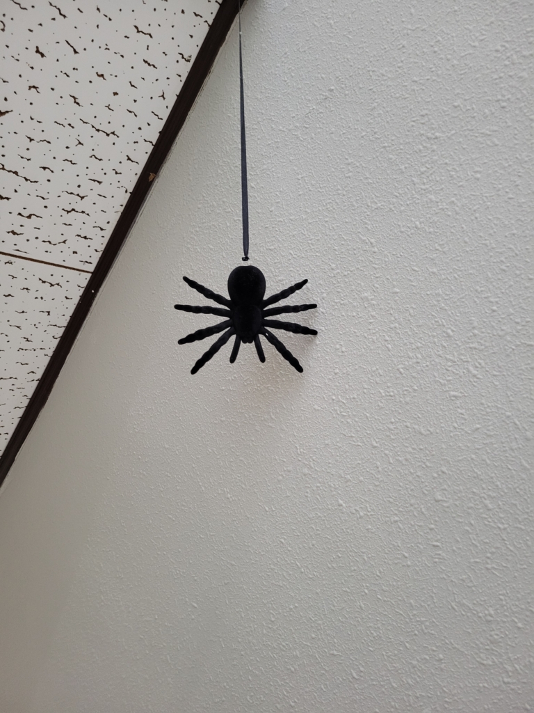 階段上部から、ぶら下がっています。風が吹くと ブラ~と動きます! とても大きなクモで、少し触って見るのも怖いかな?