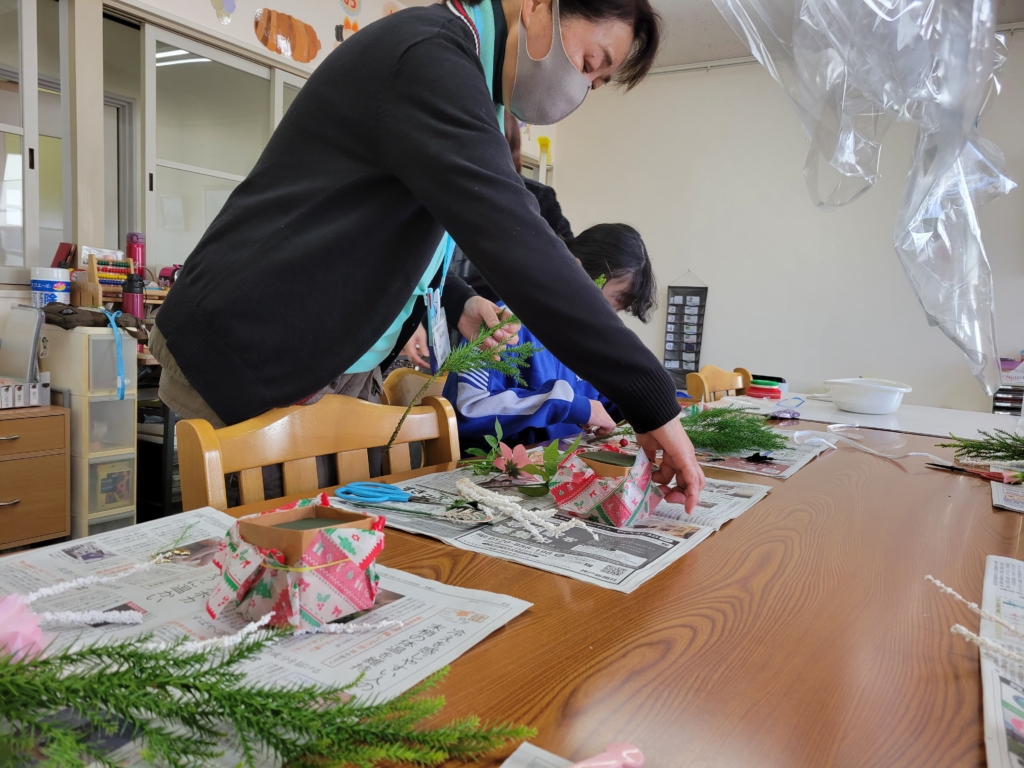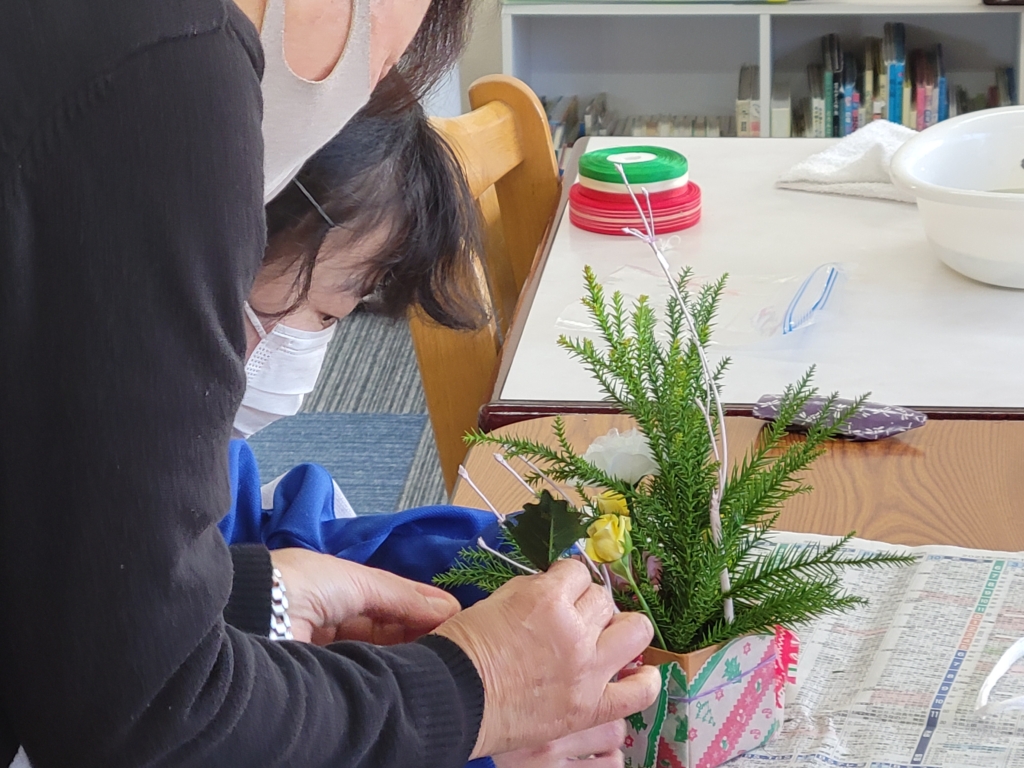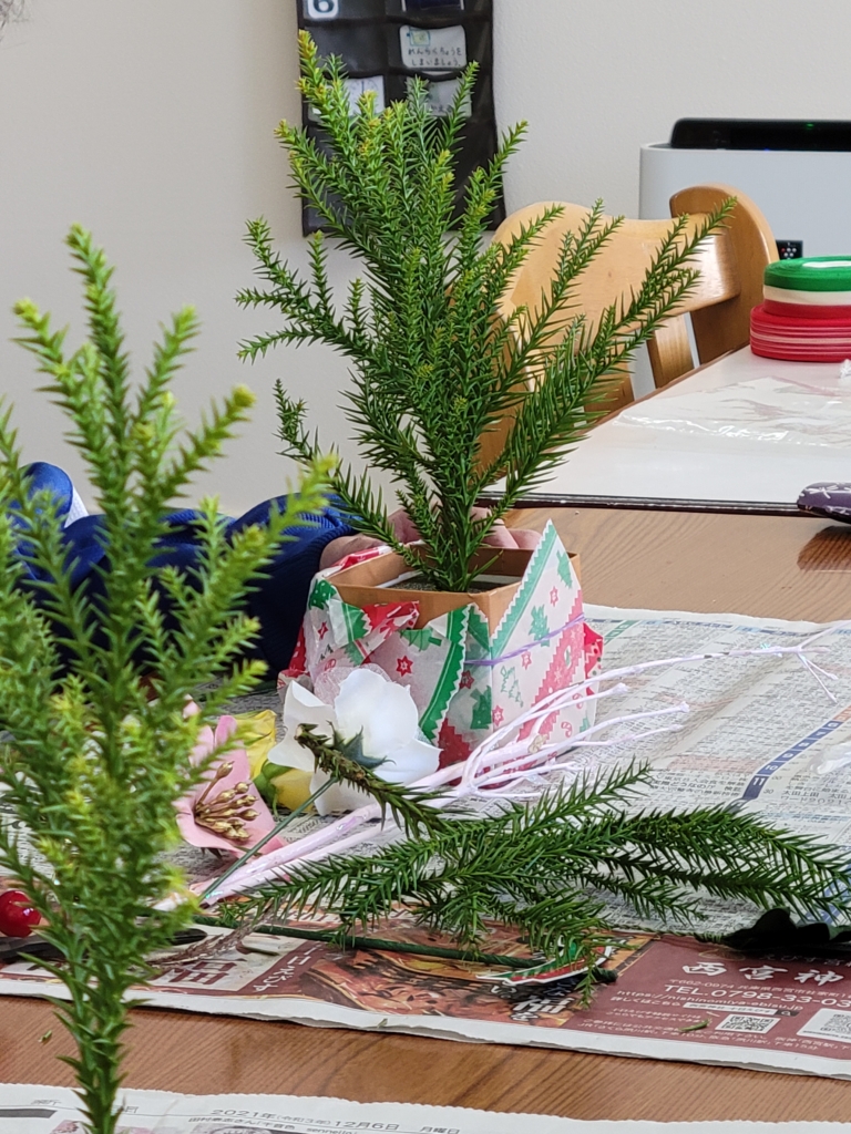 クリスマスの木 もみの木の代わりに杉の木からはじめました。造花の花・生花のミニバラ・クリスマスらしい小物類もオアシスに生けていきます!