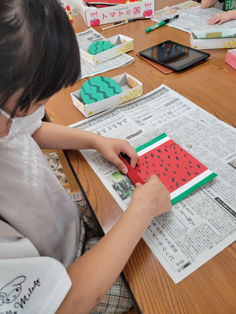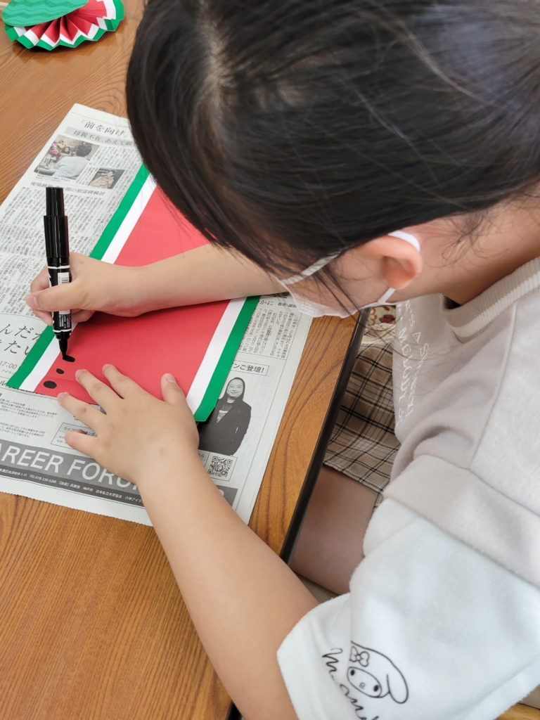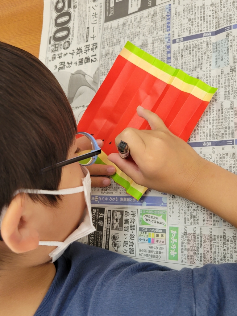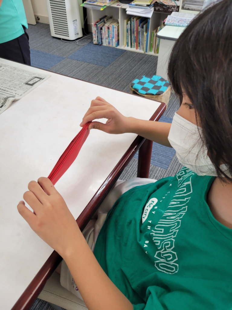 線に合わせないと…うちわが開かなくなるので 慎重に折っています!