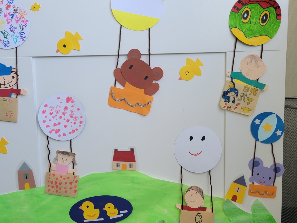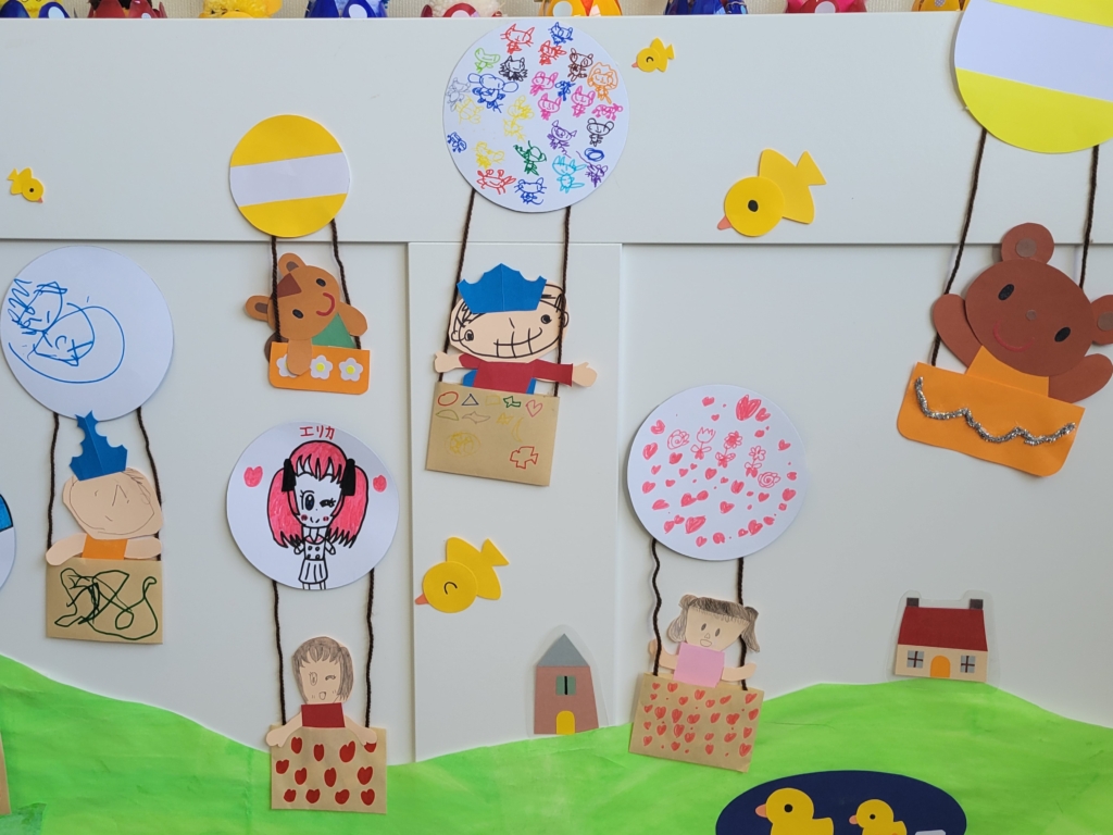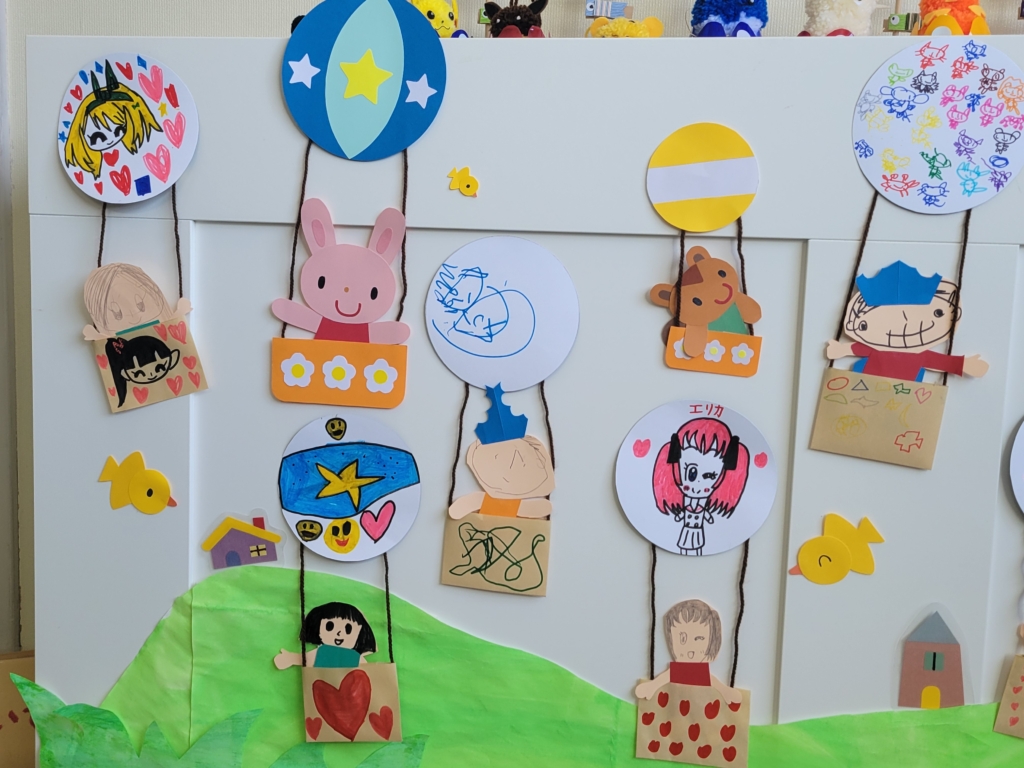 春休み中に、作成した気球を貼り出しました。空の風景は、壁が白色ですが、野原などの風景と共に完成です!