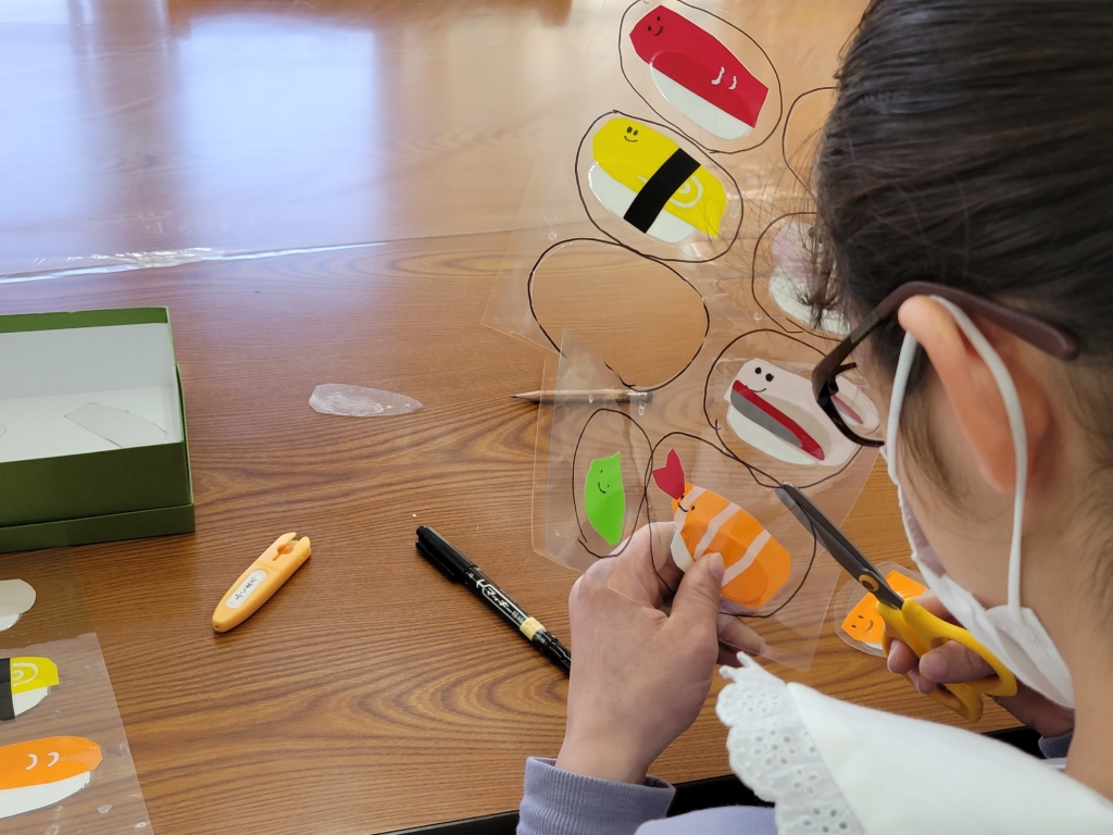 折り紙の紙から色を選び型を写して切り取る、模様や顔を書く
