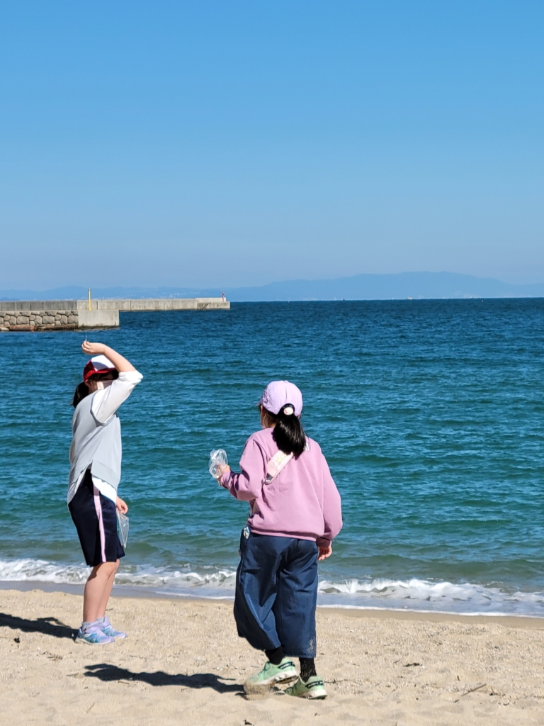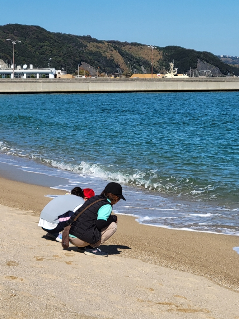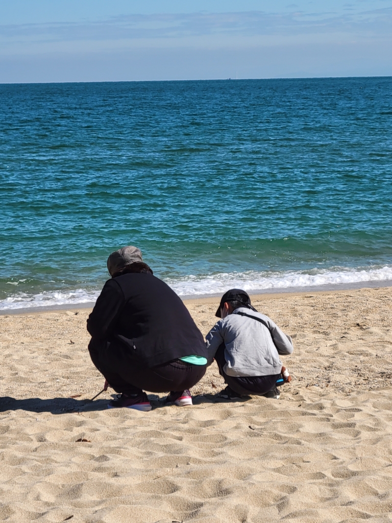 目的地の大浜海岸では、ビニール袋片手に貝がらやきれいな石をひらってきました。
