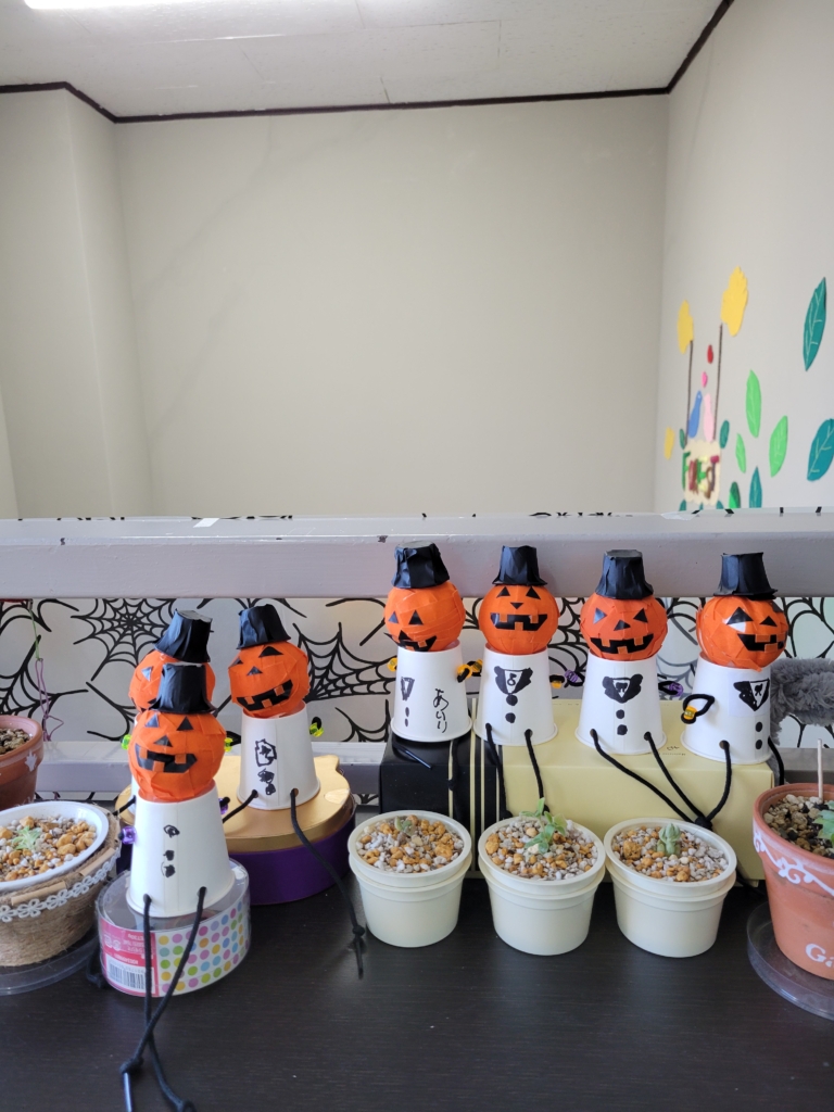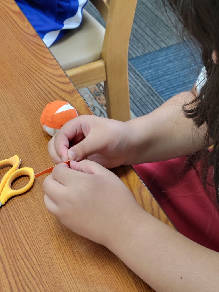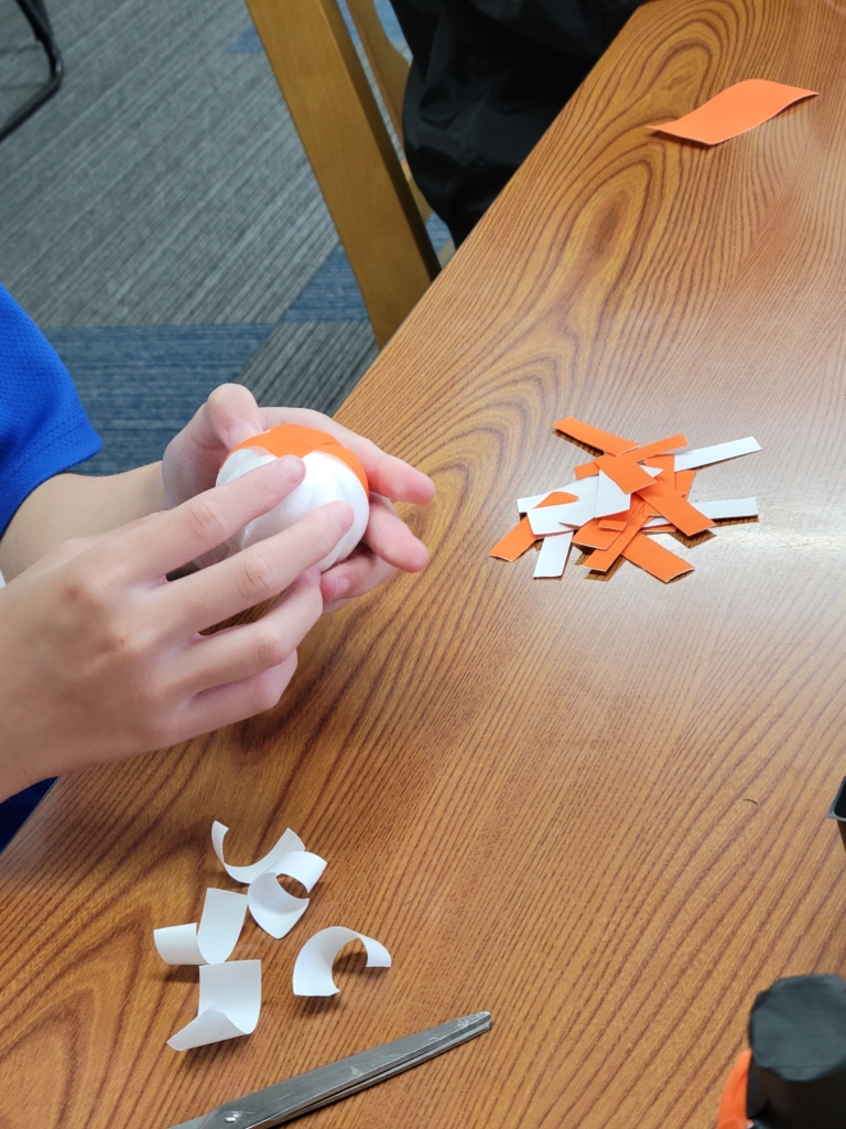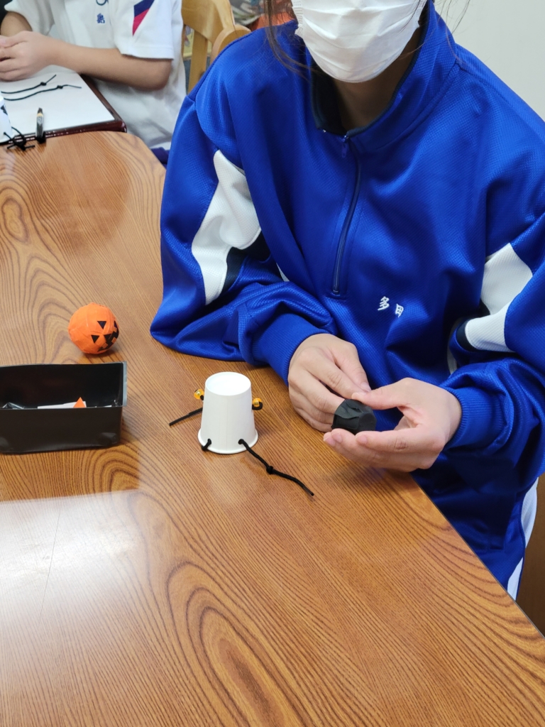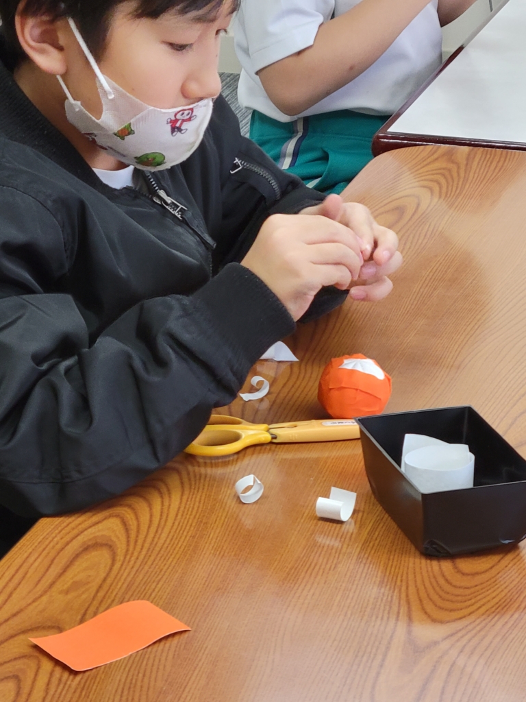 ハロウィン工作として 丸い球(手芸用の毬玉)を使って布テープを貼っていきました。