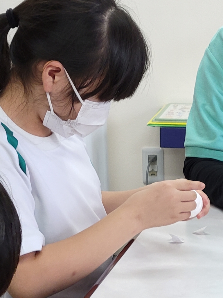 少しだけ布地の為、ちぎって貼ることも難しく、丸い球に貼ることも難しい中、頑張って作業しています。