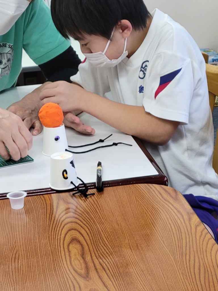 紙コップにヒモやビーズを通していきますが…手と足の通し方に変化あるので また大変!