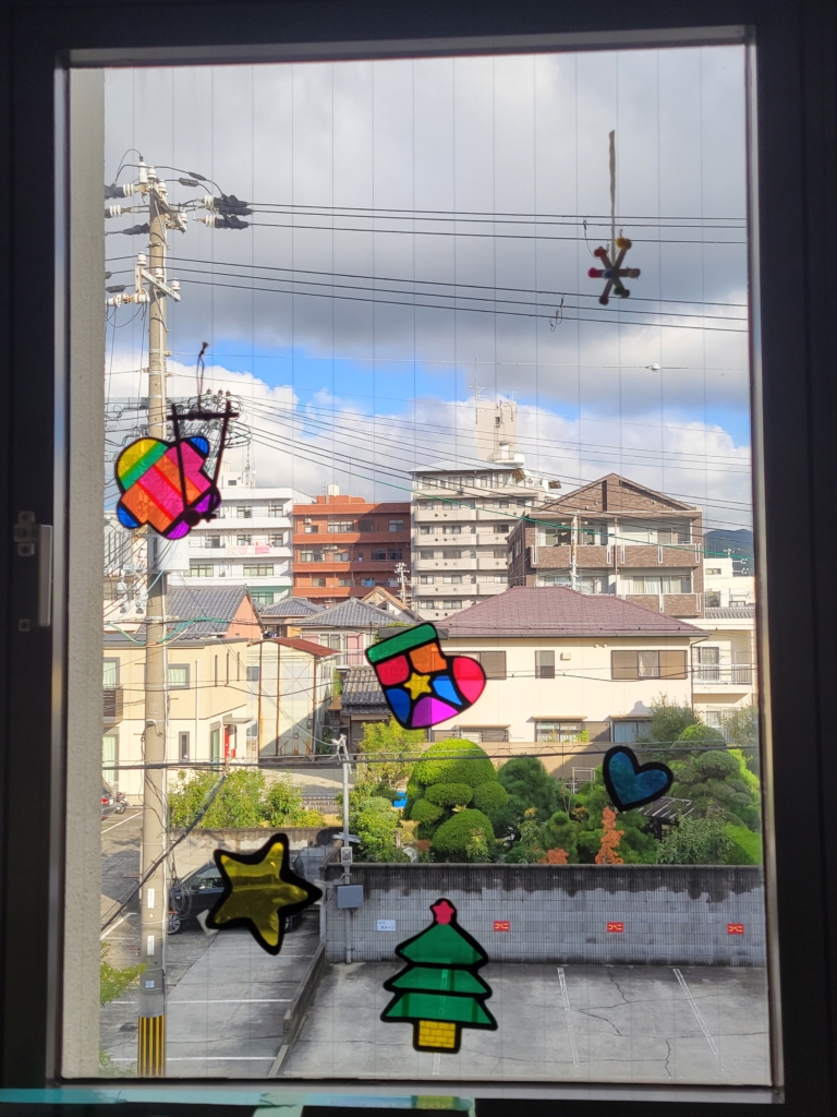 黒画用紙にカットされた絵柄にセロファン紙を貼ってステンドグラス風です。