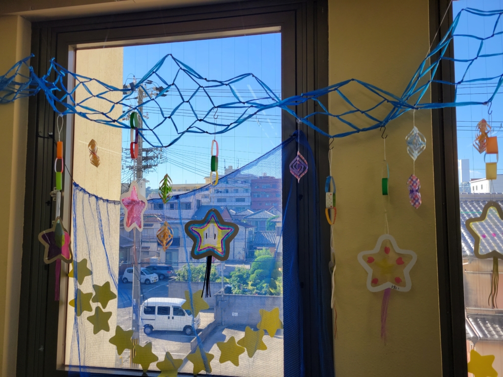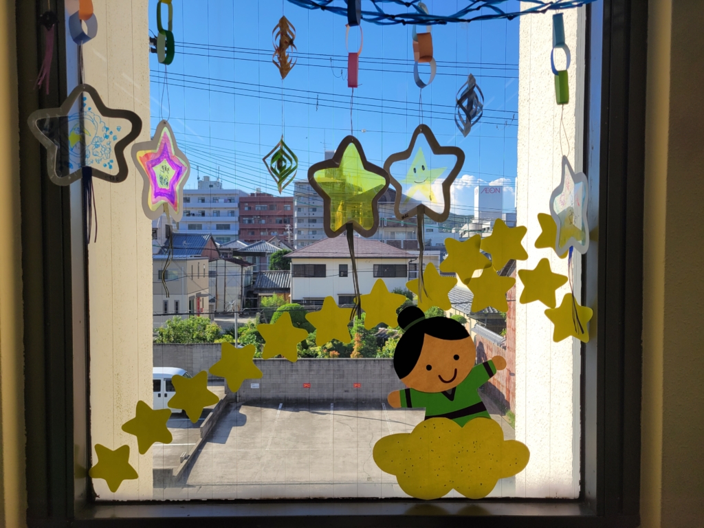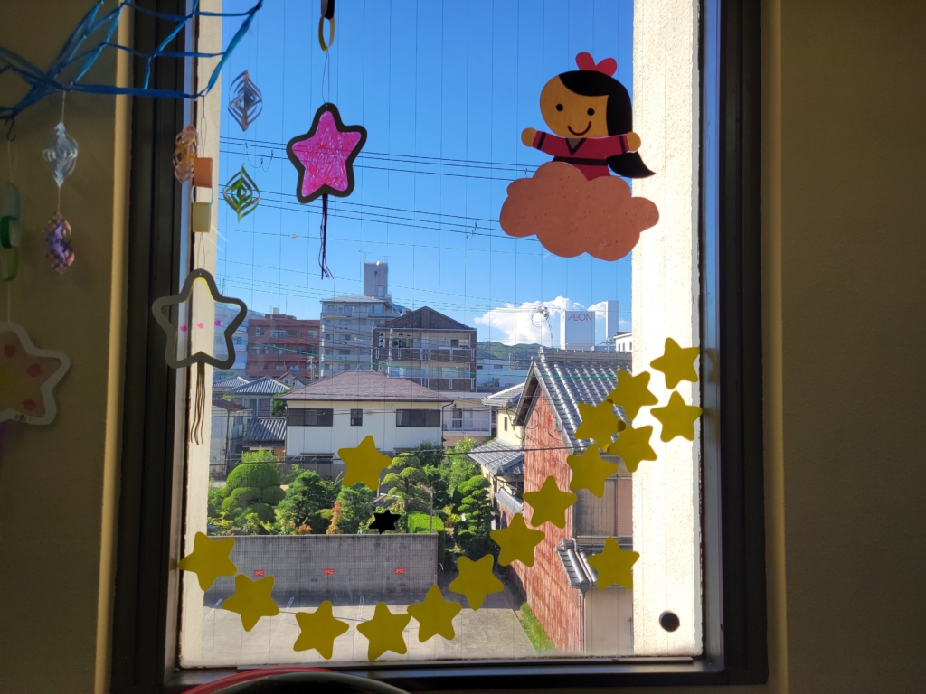 星の飾りは、透明の部分にマジックインキでステンドグラス風にしています。